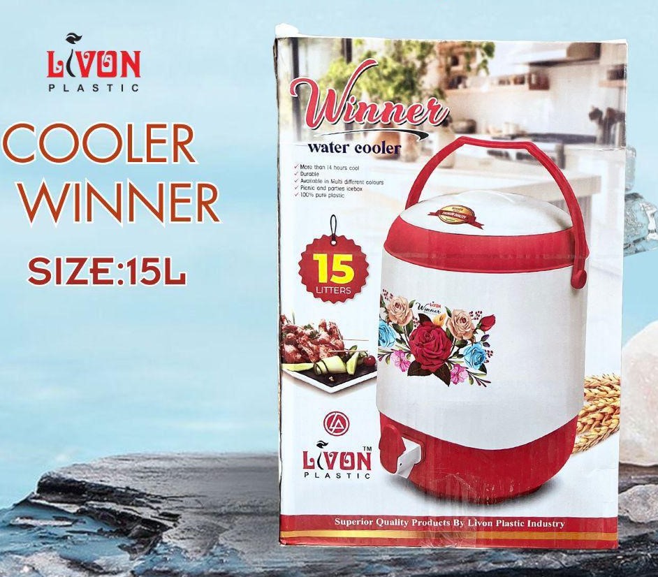 This item is a 15 liter Livon Winner plastic water cooler, manufactured by the Livon Plastic Industry.