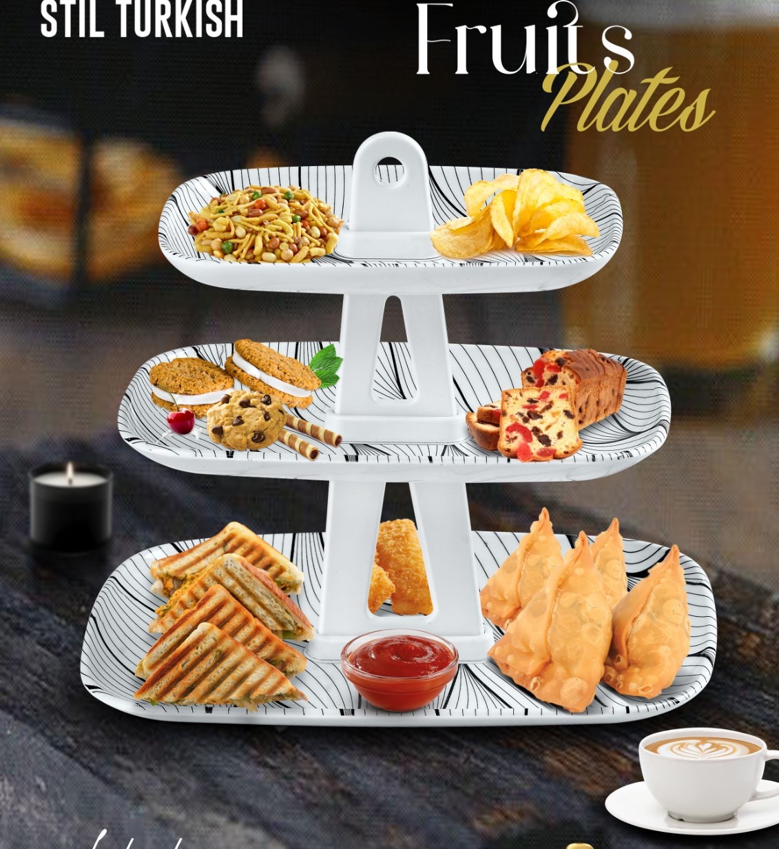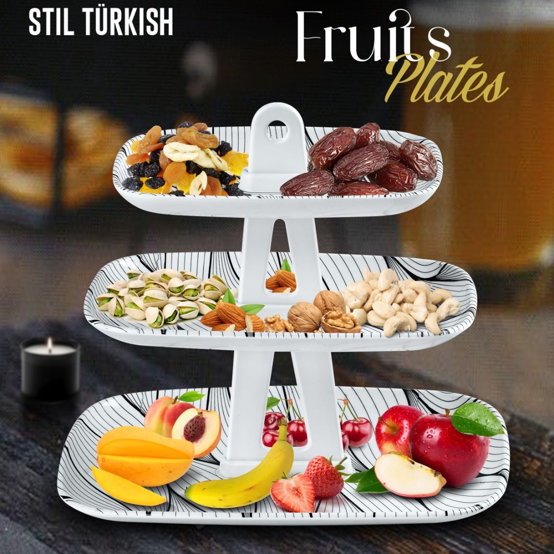 3 tier fruit stand and serving tray set, featuring white trays with a striped pattern on a stand.