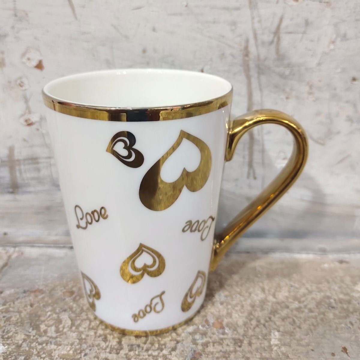 Elevate your morning ritual with a touch of romance. This exquisite ceramic mug features a sophisticated tapered silhouette, adorned with shimmering gold-foil hearts and “Love” typography. Finished with a radiant 24k-gold-style handle and rim, it’s more than just a mug—it’s a daily reminder of what matters most.