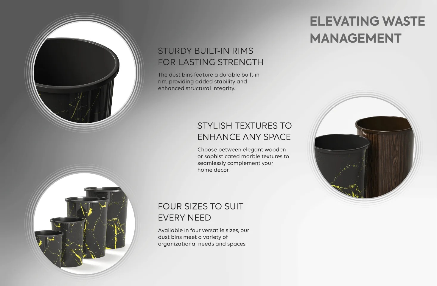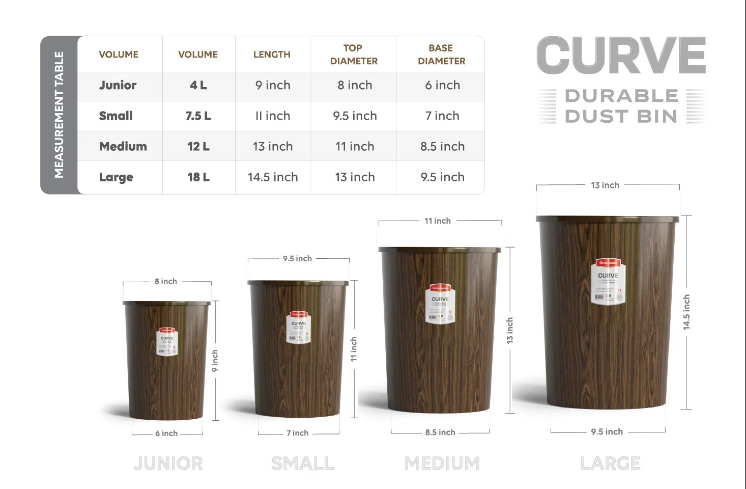 Elevate your home or office waste management with the Graceware CURVE series. These aren’t just trash cans; they are stylish accents designed to blend seamlessly with your interior decor. Featuring high-quality in-mould decals, you can choose between a warm, natural wooden texture or a sophisticated, modern marble finish.