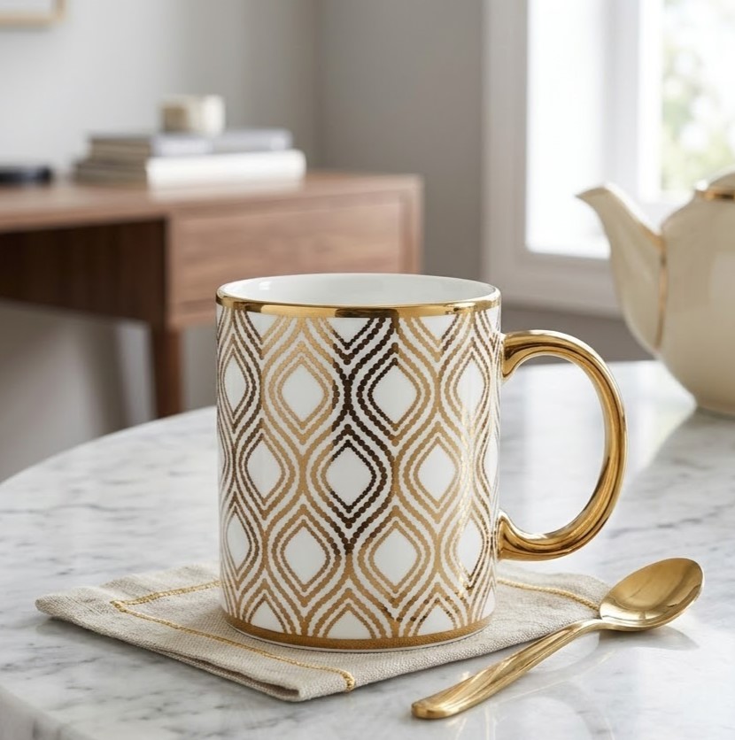 Modern Gold Honeycomb Ceramic Mug – White & Gold Designer Coffee Cup